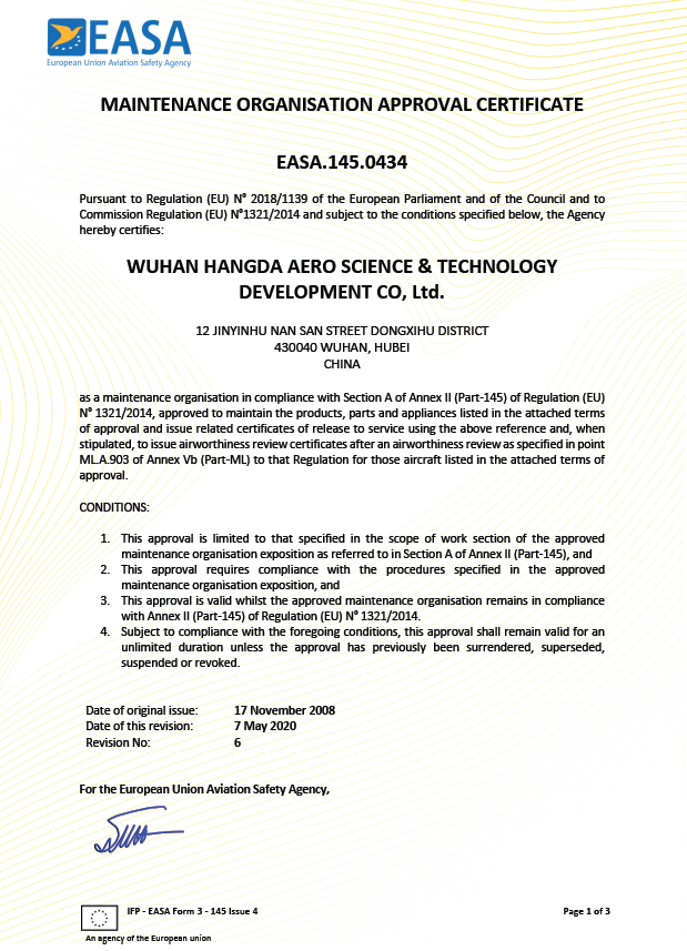2020年5月 徑河廠區獲得EASA維修許可。